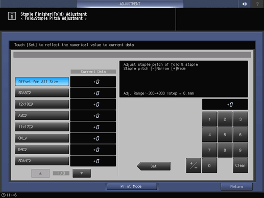 Control panel - Utility/Counter - [Administrator Setting] - [System Setting] - [Expert Adjustment] - [Finisher Adjustment] - [Staple Finisher Adjustment] - [Staple Finisher(Fold) Adj.] - [Fold&Staple Pitch Adjustment] | |||